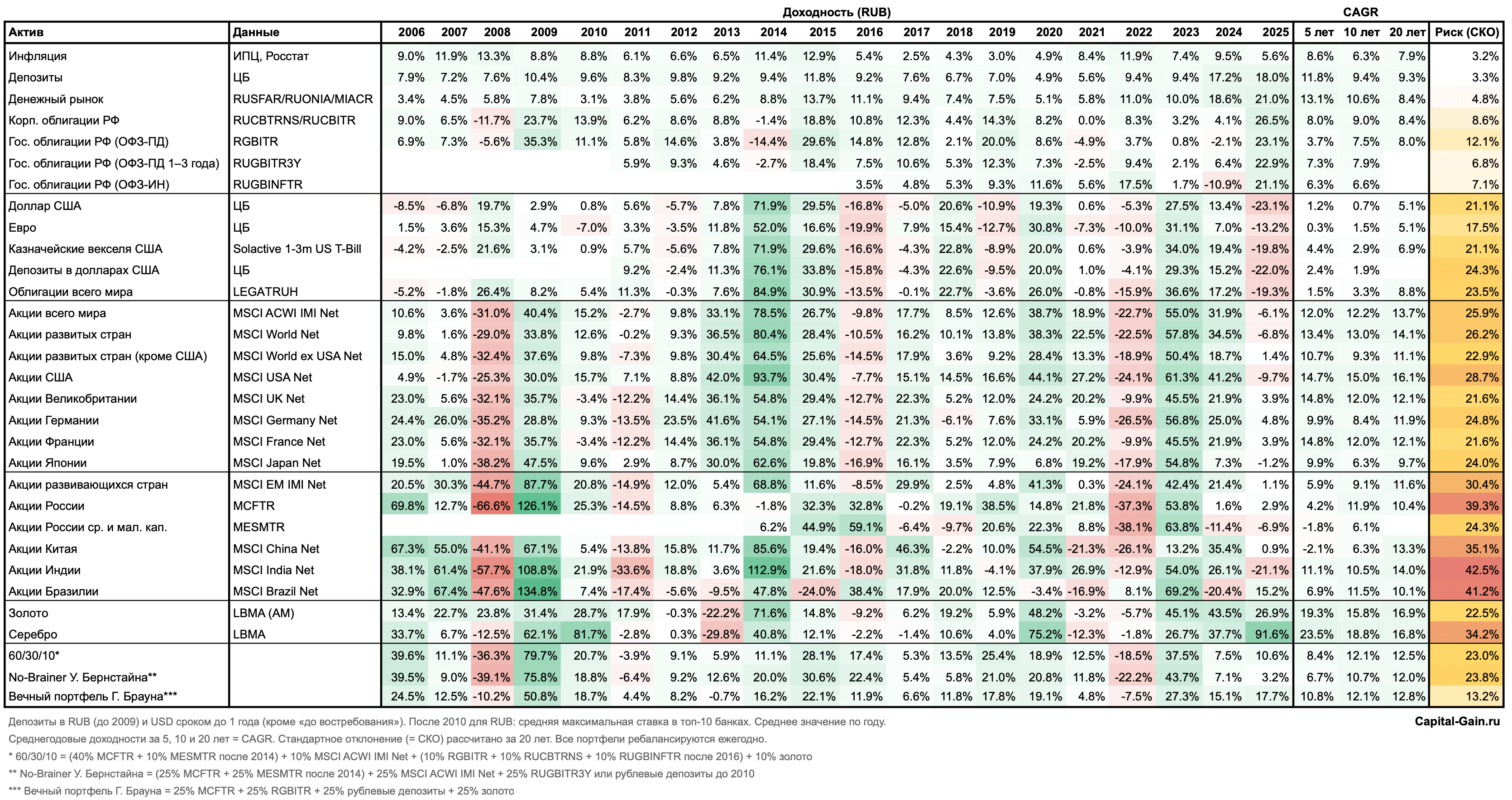 Обновленные данные, включающие 2025 год, по инфляции, долговым рынкам, валютам, акциям, драгоценным металлам и нескольким модельным портфелям.